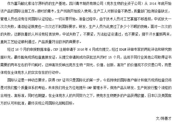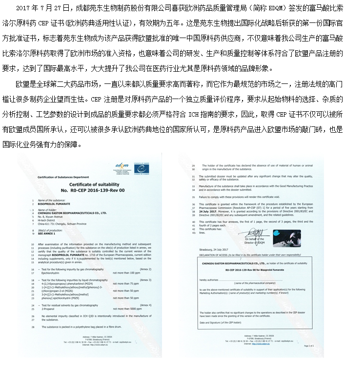 比索洛尔喜获CEP证书 国际化取得突破性进展